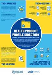 The Health Product Profile Directory provides a searchable database of profiles for health products needed to tackle pressing health issues in global health including those prioritized by WHO.